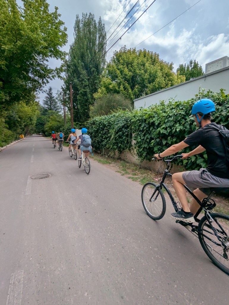 I think it’s nicest to arrive at Maipu to the southeast of Mendoza using the Metrotranvia (about 40 minutes) for the experience of using a light rail in a different country. But I am biased as a big proponent of public transportation; an Uber would take only about 20 minutes. Keep in mind that the bike lanes in Maipu aren’t perfect. They were comically narrow at some points. Even as I made it away from the town and further into vineyard land, I still had to stay aware of huge trucks that would occasionally ride past you. I found it funny (but responsible) that the company I used in Maipu, Wine and Ride, sent me a message half way through the day reminding riders to hydrate!